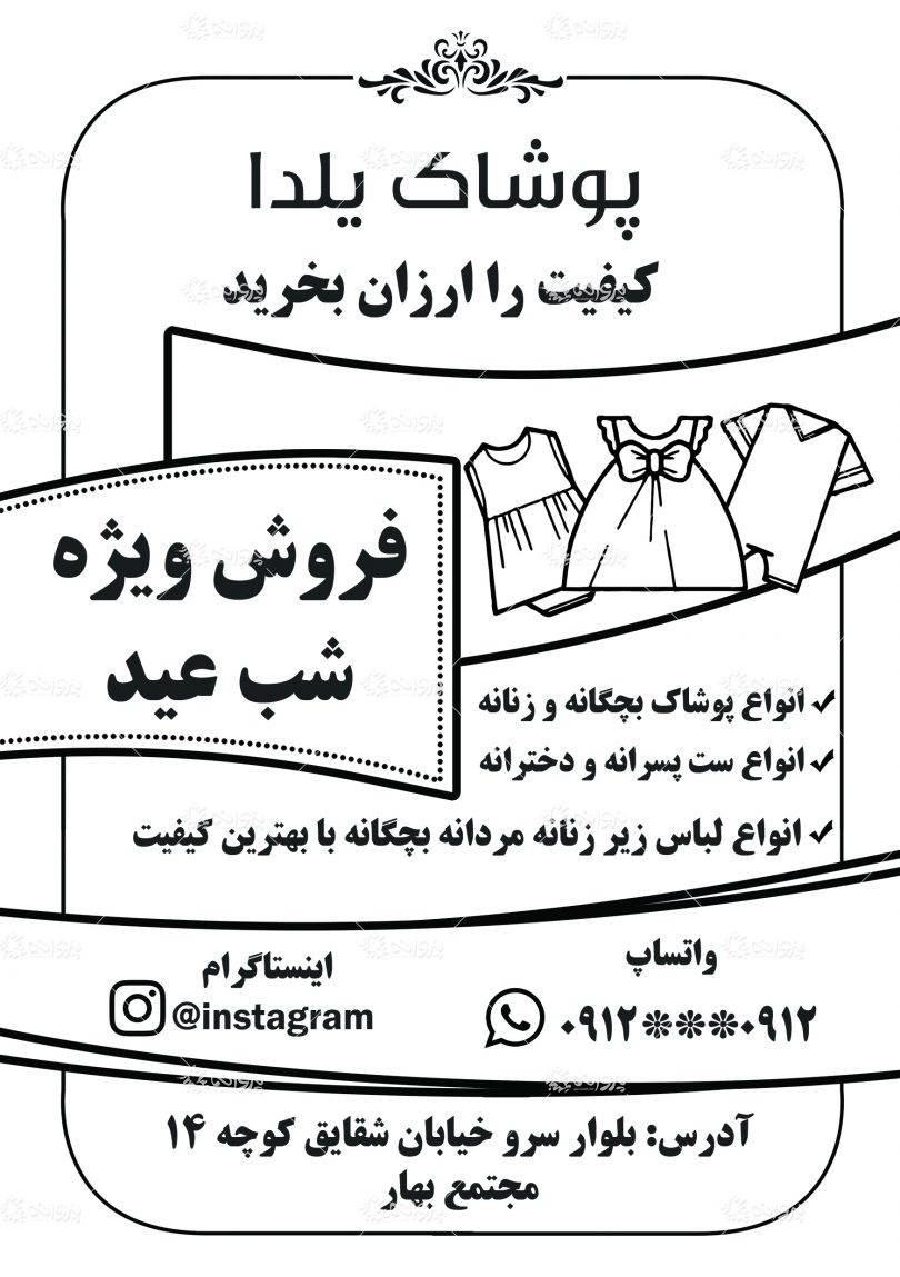 تراکت فروشگاه پوشاک بچه گانه و زنانه تک رنگ